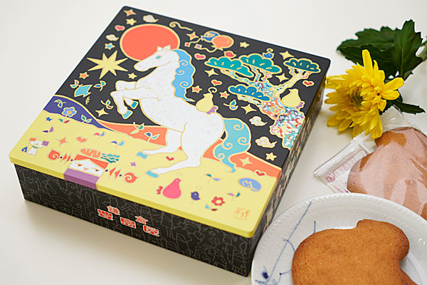 鎌倉豊島屋「鳩サブレー」の干支缶。古家野雄紀さんのメルヘンチックな絵柄が素敵。ポップでかわいくて楽しくて賑やか。(2026年1月4日)